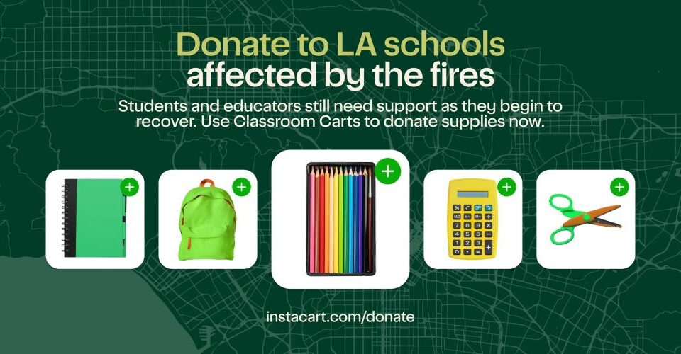 Instacart has launched a Classroom Carts initiative to support 28 Los Angeles County public and charter schools and nearly 15,000 students affected by the wildfires earlier this year. These Classroom Carts allow people across the country to support students and teachers by donating essential supplies directly to impacted schools.